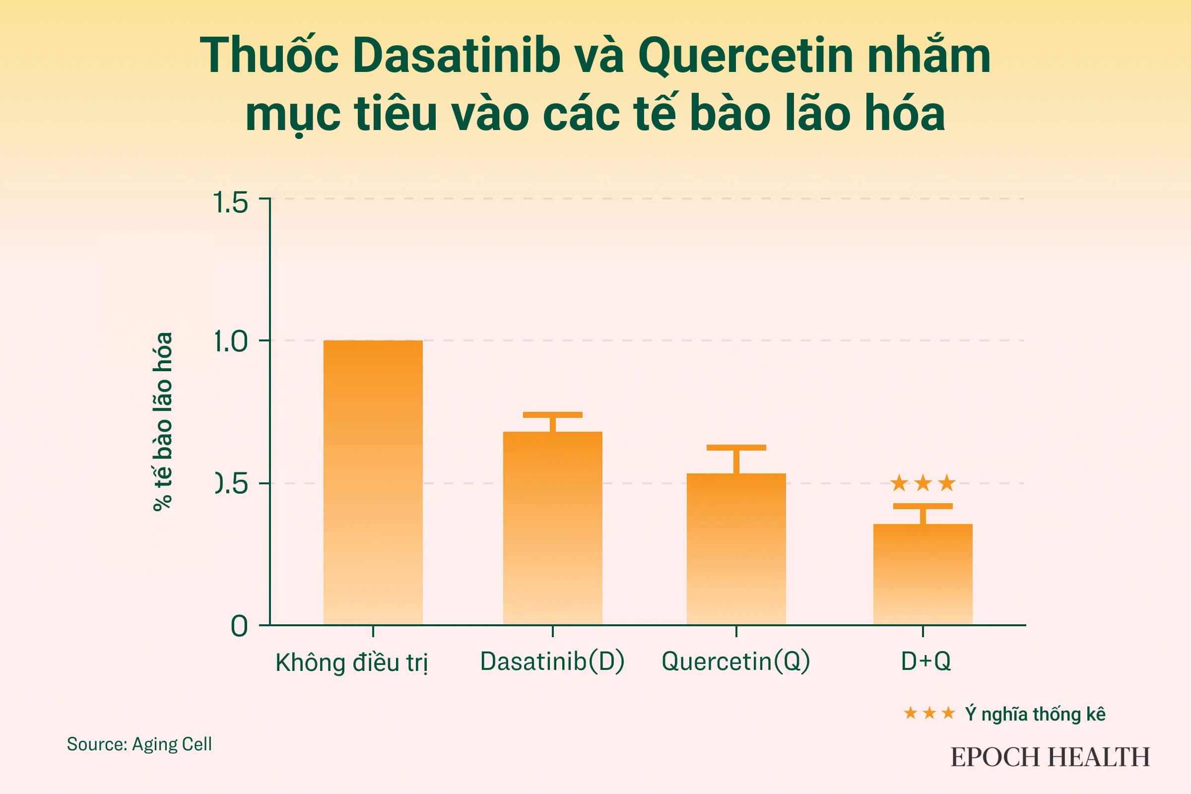 Dasatinib đã loại bỏ các tế bào tiền thân của tế bào mỡ già ở người, trong khi quercetin có hiệu quả hơn đối với các tế bào nội mô già ở người và tế bào gốc có nguồn gốc từ tủy xương ở chuột.
