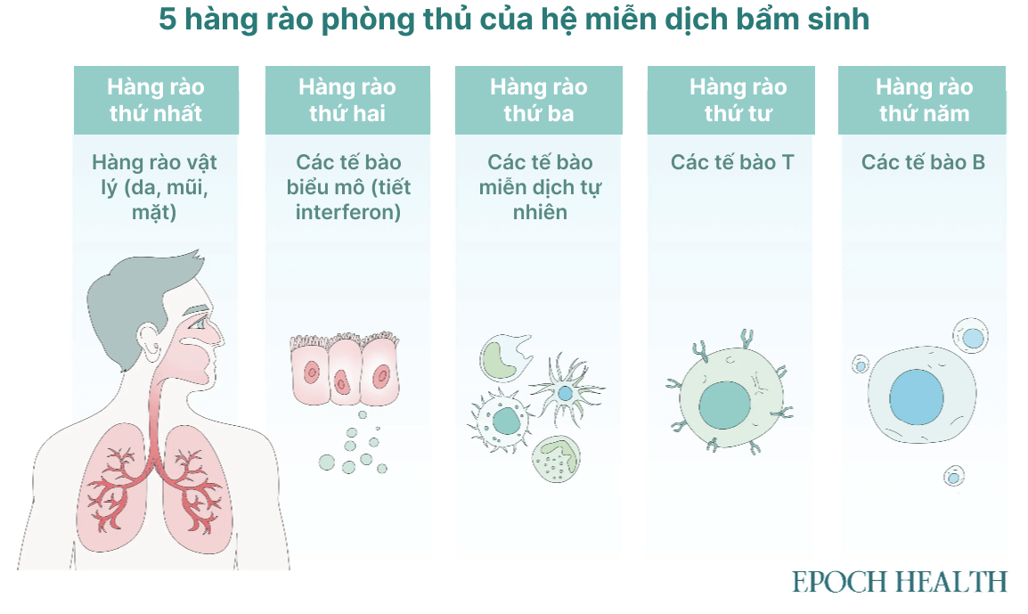 Hệ miễn dịch của cơ thể chúng ta có thể được chia thành năm lớp. Ba lớp đầu tiên được xem là khả năng miễn dịch bẩm sinh hoặc tự nhiên, bao gồm lớp thứ nhất là da, mũi và mắt của chúng ta; lớp thứ hai là các tế bào biểu mô niêm mạc trong đường hô hấp hoặc đường tiêu hóa tiết ra các protein kháng virus mạnh như interferon; lớp thứ ba là các tế bào miễn dịch bẩm sinh như tế bào tiêu diệt tự nhiên và đại thực bào có khả năng tiêu diệt virus xâm nhập. Hai lớp miễn dịch cuối cùng hoạt động theo cách chuyên biệt, bao gồm tế bào T và tế bào B có thể tạo ra khả năng miễn dịch tế bào hoặc kháng thể đặc hiệu với virus.