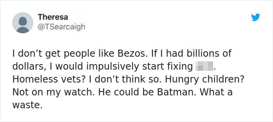 Theresa Searcaigh, một nhà văn Mỹ gốc Ailen chuyên viết các tiểu thuyết viễn tưởng văn học, đã đăng một tweet hỏi cộng đồng mạng rằng tại sao các tỷ phú như Jeff Bezos không dùng tài sản của mình để giúp các cựu chiến binh vô gia cư hay những trẻ em nghèo đói. Theo cô, “ông ấy có thể trở thành người hùng như Batman”, nhưng tất cả đều “thật lãng phí”.