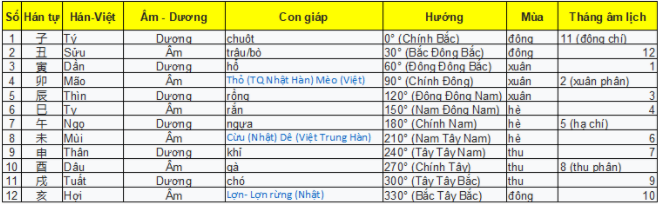 12 Địa chi gồm có: Tý Sửu Dần Mão Thìn Tỵ Ngọ Mùi Thân Dậu Tuất Hợi là 12 con vật thân thuộc trong đời sống các nước nông nghiệp Đông Á và cũng để chỉ phương hướng trên mặt đất cũng như chỉ giờ.