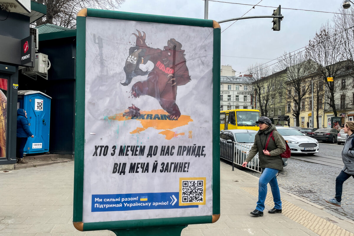 Trên một số ngã tư xa lộ đông đúc, các bảng yết thị thời chiến xuất hiện cùng với bảng quảng cáo thời tiền chiến. Trong một cụm bảng quảng cáo, gồm quảng cáo cho cung cấp bê tông trộn, một cho phòng khám tư nhân, một cho nhà thờ, và một cho kênh truyền hình xuất hiện bên cạnh một bảng yết thị ủng hộ quân đội, có nội dung: “Hỡi những người lính, các anh thật vĩ đại! Ukraine sát cánh cùng các anh!”