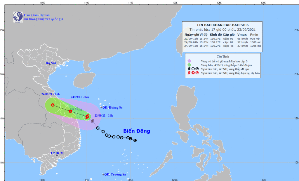 Dự báo trong 12 giờ tới, bão đi vào khu vực từ Thừa Thiên Huế đến Quảng Ngãi, suy yếu dần thành áp thấp nhiệt đới. Đến 4h ngày 24/9, vị trí tâm áp thấp nhiệt đới ở ngay trên đất liền khu vực từ Thừa Thiên Huế đến Quảng Nam với sức gió mạnh cấp 6-7 (40-60 km/giờ), giật cấp 9.