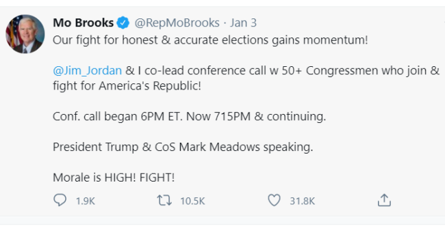 Dân biểu Mo Brooks (Cộng Hòa-Alabama) cho biết Tổng thống Donald Trump và các thành viên Đảng Cộng Hòa tại Hạ viện đã tổ chức một cuộc điện đàm để thảo luận về việc phản đối phiếu Đại cử tri đoàn trong Phiên họp chung ngày 06/01 của Quốc hội, ám chỉ cuộc chiến của họ đang đạt được hiệu quả.