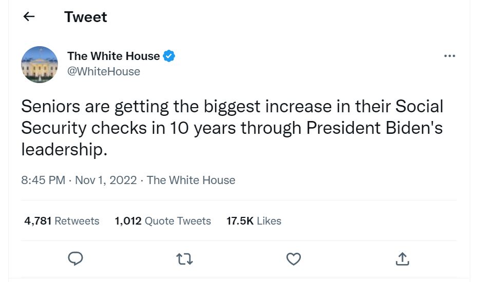 “Người cao niên đang nhận được mức tăng lớn nhất trong các khoản thanh toán An sinh Xã hội của họ trong 10 năm dưới sự lãnh đạo của Tổng thống Biden,” bài đăng trên Twitter của Tòa Bạch Ốc hiện đã bị xóa cho biết.