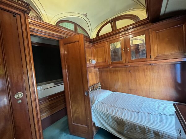 Tôi biết đây là chiếc xe lửa của hãng Pullman và là một phần của tuyến đường sắt ngắn Oregon thuộc Liên minh Thái Bình Dương [OSL] năm 1903, nhờ vào tấm biển trưng bày được đóng khung trong toa xe lửa này. Vào giữa thế kỷ 19, ông George Pullman đã phát triển những toa xe lửa sang trọng, đôi khi được gọi là “toa xe cung điện.”