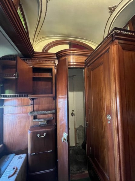 Hơn một thế kỷ sau, tấm ốp gỗ gụ Honduran của toa xe lửa này vẫn sáng bóng. Các tấm gỗ được chạm khắc tỉ mỉ và phủ màu phong phú, kính vát được lắp ở các cửa sổ nhỏ hình vòm, và các tấm gương trang trí mở rộng thêm không gian. Các tay nắm cửa, các ổ khóa, tay kéo, và các thiết bị chiếu sáng làm bằng đồng được thiết kế sang trọng. Phần trần hình khay úp ngược nổi bật với các chi tiết đồng uốn cong. Các cửa vào được tô điểm bằng các họa tiết trang trí hình xoắn ốc. Thậm chí tủ quần áo bên trong phòng thay đồ cũng được trang trí các thanh đồng thau và các ngăn đựng đồ bằng gỗ được chạm khắc thủ công. Vải nhung bắt mắt được dùng để bọc ghế, sofa, và băng ghế hành khách.