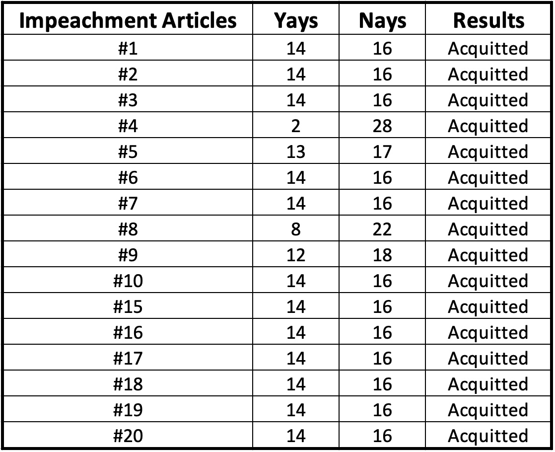 Thượng viện tiểu bang cũng đã bỏ phiếu bác bỏ bốn điều khoản đàn hặc đã bị hoãn lại bằng một cuộc bỏ phiếu với tỷ lệ 19 phiếu thuận và 11 phiếu chống.