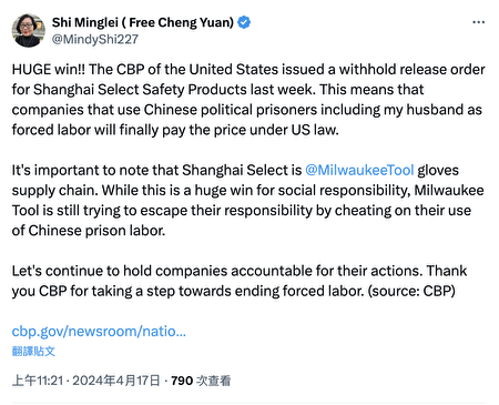 Bà Thi Minh Lỗi (Shi Minglei), vợ của tù nhân chính trị đang bị giam cầm Trình Uyên (Cheng Yuan), đã không ngừng tiếp sức cho cuộc chiến chống lao động cưỡng bức trong thời gian dài. Bà viết trên trang cá nhân của nền tảng X rằng: “Thật đáng mừng! Hải quan Hoa Kỳ đã cấm chuỗi cung ứng găng tay sản xuất ở Trung Quốc của Milwaukee Tool. Nguyên nhân là vì những găng tay này được các tù nhân tại nhà tù Xích Sơn, Hồ Nam sản xuất.”