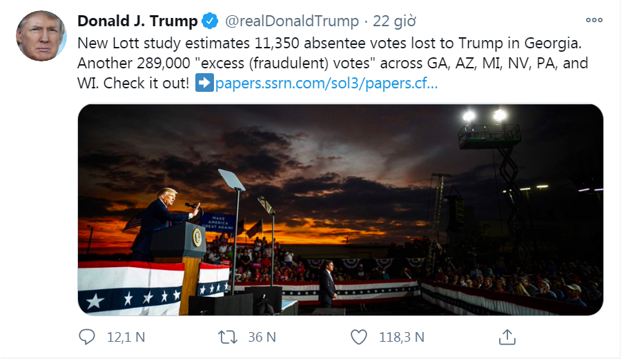 Ông Trump đã đăng tải một liên kết đến nghiên cứu của ông Lott trên Twitter, với dòng tweet: “Nghiên cứu mới của Lott ước tính có 11,350 phiếu khiếm diện đã thua cho Trump ở Georgia. Lại có 289,000 ‘phiếu dư (gian lận)’ khác ở Georgia, Arizona, Michigan, Nevada, Pennsylvania và Wisconsin.”
