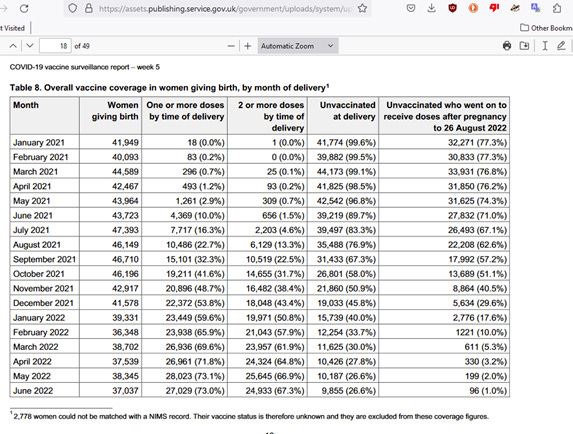 12,751 phụ nữ chích vaccine Pfizer, và 8,365 phụ nữ chích vaccine Moderna. 422 phụ nữ chích vaccine Pfizer, chiếm 3% tổng số phụ nữ chích Pfizer, bị sẩy thai (sảy thai vào tuần thứ 20), và 395 phụ nữ chích vaccine Moderna, chiếm 4.7% tổng số phụ nữ chích vaccine Moderna, bị sẩy thai.