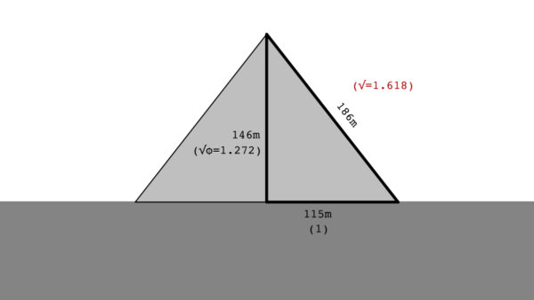 Ví dụ, nếu lấy tổng diện tích của bốn mặt chia cho diện tích đáy, ta sẽ được 1,618. Một ví dụ khác: nếu lấy một mặt cắt ngang của kim tự tháp để thấy được hai tam giác vuông. Cạnh huyền của một tam giác, hay chiều dài từ đáy kim tự tháp đến đỉnh của nó sẽ là 186 m; khoảng cách từ tâm của mặt đáy tới đỉnh là 115 m. Và nếu lấy 186 m chia cho cho 115 m thì một lần nữa, kết quả lại là 1,618.