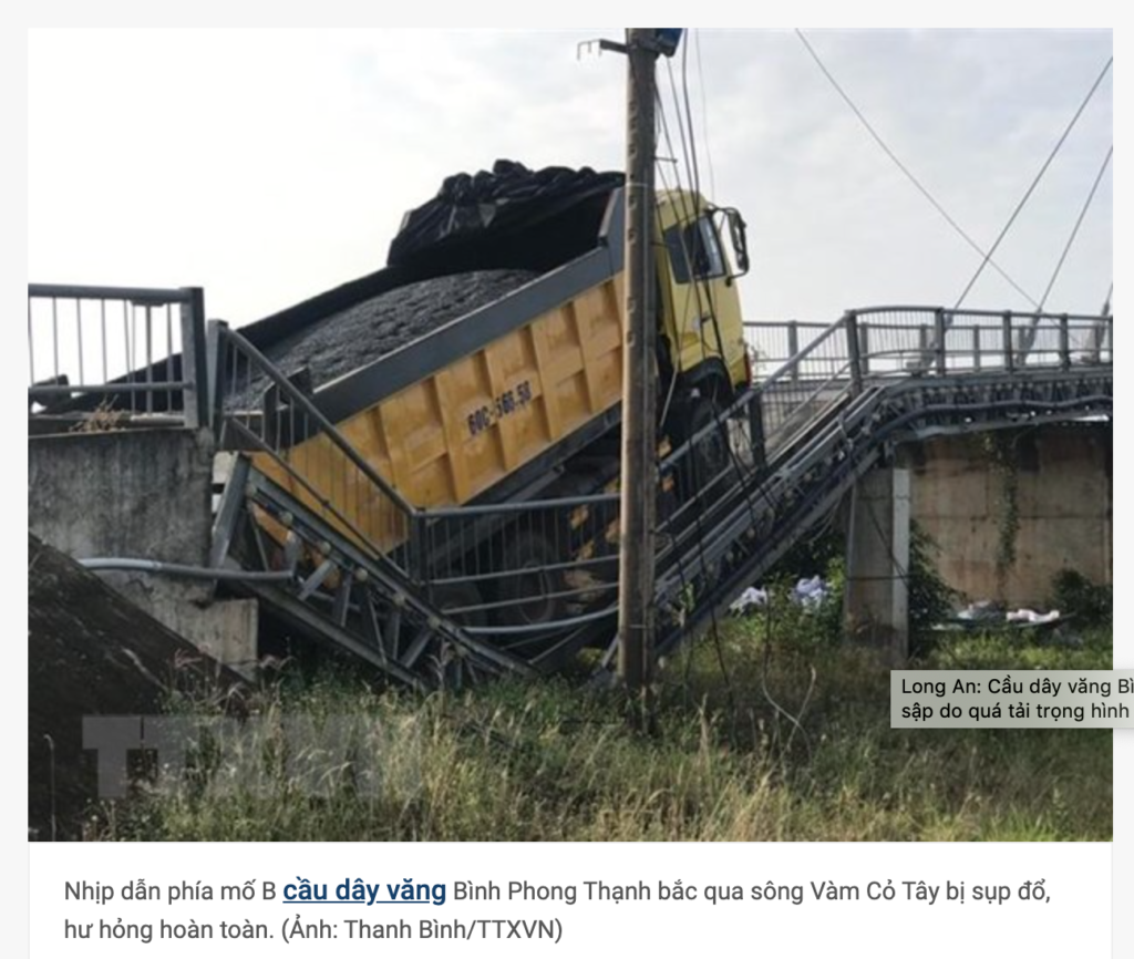 Việc chở quá tải làm nhịp dẫn phía mố B cầu dây văng bắc qua sông Vàm Cỏ Tây sụp đổ, hư hỏng hoàn toàn.